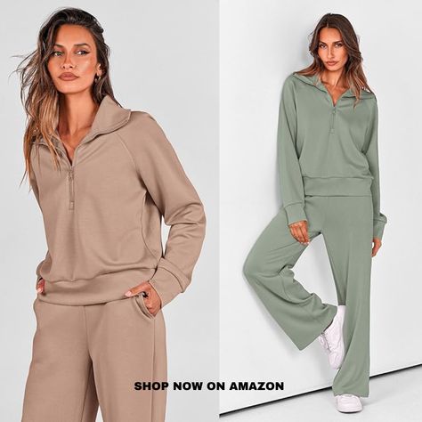 Design: A modern half-zip sweatshirt paired with flowy, wide-leg pants.
